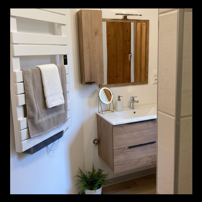• une belle salle de bain moderne avec douche à l’italienne • un WC séparé • un espace commun comprenant cuisine équipée et séjour lumineux • une vue dégagée sur le Doubs et les montagnes