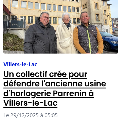 À Villers-le-Lac, face au projet de la municipalité de vendre l'ancienne usine d'horlogerie Parrenin à un promoteur, un collectif s'est crée pour défendre ce bâtiment qui date de 1876. Ses membres demandent le classement du bâtiment pour éviter une potentielle destruction.